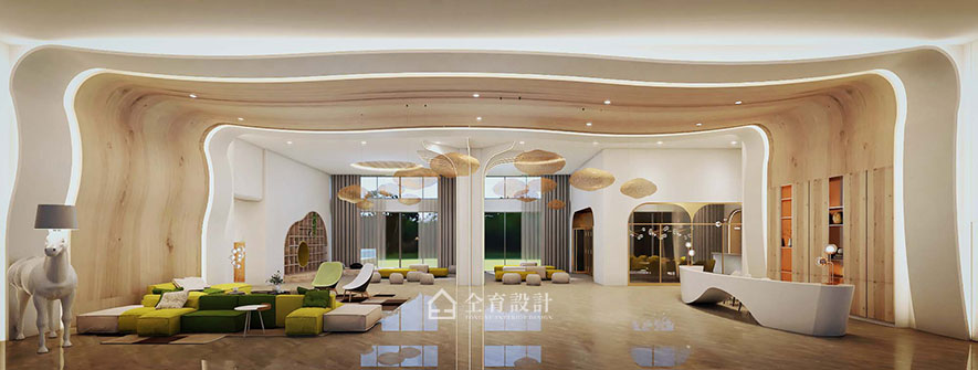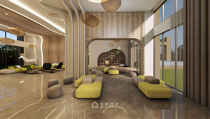 各個公設中的開放空間,裝飾具有透氣滲水功能的石材,並與大自然氣息及陽光串連流通,場域在綠色建築的概念下,彰顯獨特的設計概念。