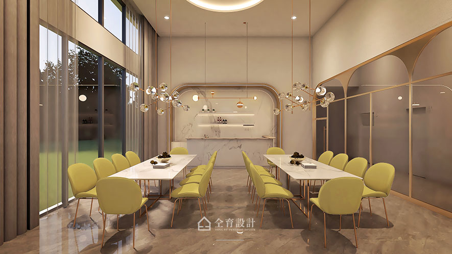 空間中的環境設計理念源自共享概念,而在大門入口設置的綠意植栽,使得通往的公設大廳的路上,充滿樹木成蔭的氛圍,並呈現大樹綠景包圍的景色,讓大樓居民至此皆能度過悠閒時間。