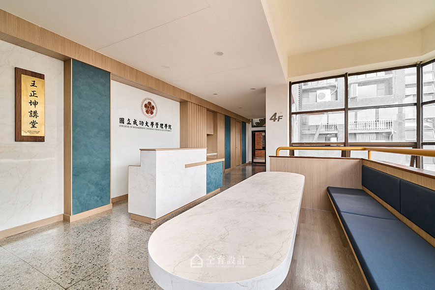 休憩區則是廊道空間的一大亮點,為讓師生在課堂外也能休憩與自在交流,設計團隊重新調整桌體比例劃出座位空間,並在桌腳融入格柵設計,兼具通透感與細節美感。四周環繞的窗景映入自然光線,搭配木質元素與藍綠色軟墊座椅,營造自在舒適氛圍。這裡不僅成為行走間的停歇角落,更成為課堂之外的交流場域,使迎賓氛圍在明亮光影中格外輕鬆愉悅。