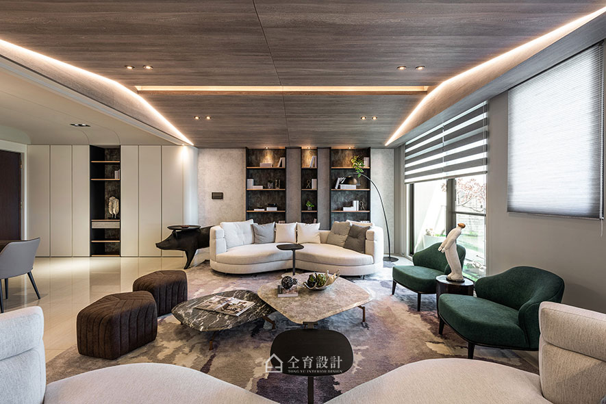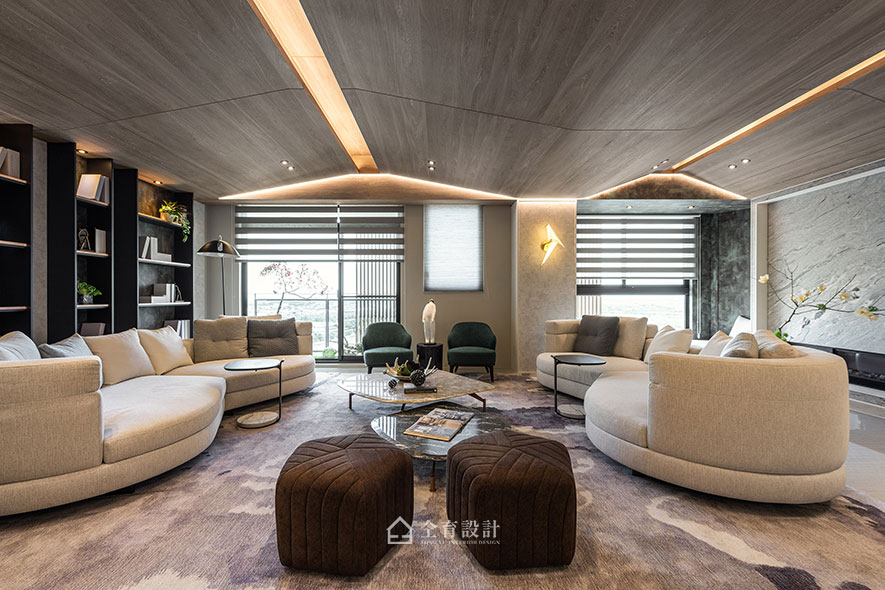 小嵌燈、燈帶等多元的燈光配置,營造舒適的休閒氛圍,或幽暗靜謐,或明亮平和,皆可自由選擇;其中位於客廳上方的帶狀光源,更有效襯托山形天花板造型,讓高低起落的形態,顯得光采動人。
