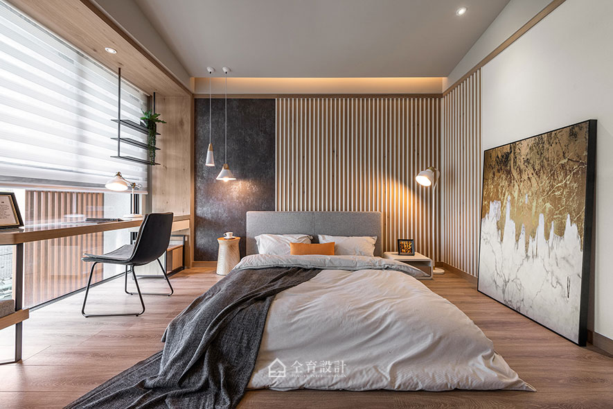 稍稍迂迴的空間動線,創造歸宅後消除外在疲憊的地帶,使家宅成為修行的場所;於格局配設上,設置拉門的主臥室和客房通道,獨立出公、私領域,便於訪客、朋友聚會時區隔場所;考量未來消費族群的二代兒孫也可能為使用者,不設置床架、架高地板的客房,衍伸空間的彈性使用性。