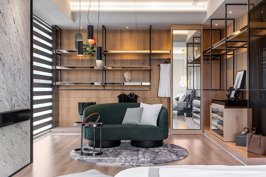 家宅中具自然紋理的板材,與冷調的鐵件等選材,藉由大地色系的軟裝的搭組,相互平衡各自感官溫度。客廳臥榻旁,使用略微銅綠的高級壁板,和兩張湖水綠的主人椅座呼應,並與木皮天花板相襯,成為葉片形象,生成閒逸、療癒人心景象;配合戶外風景,陽台擺放簡易植栽,綠意飄逸,與夕陽耀眼相對。
