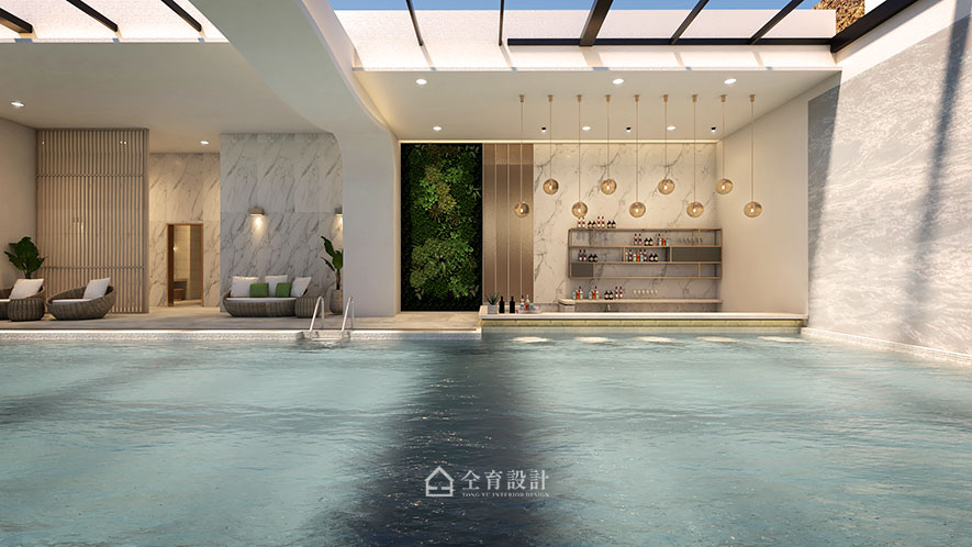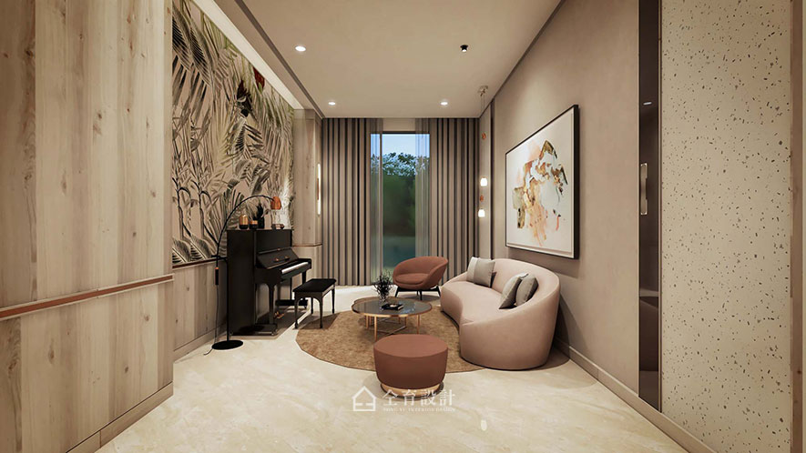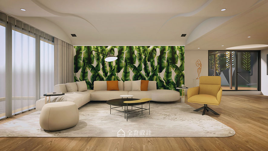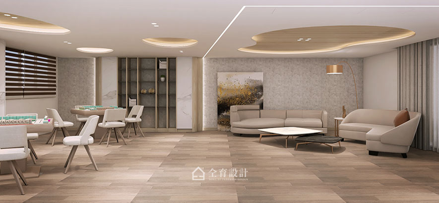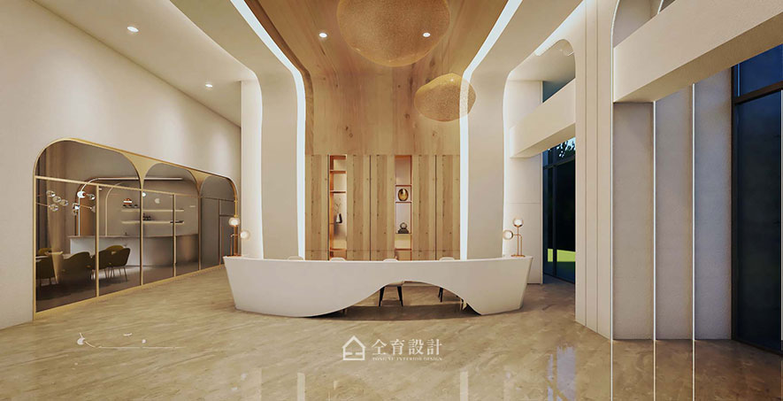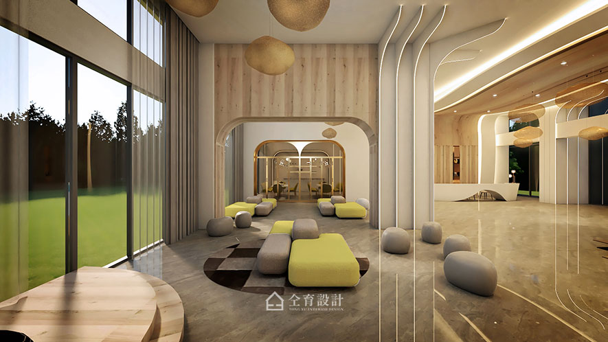 "Nature" is the hub notion of this project. The original column in the center of the building is furnished as a tree trunk; moreover, equipped with light strips to serve as the branches, marvelously shape the solid foundation image. Make use of balmy timbers and curve wavy pattern to carry out the tree cave ambiance of the public area. Draw the exterior green elements into the space, and couples with the furnishings of the matching color system, successfully bring a refreshing and captivating experience.