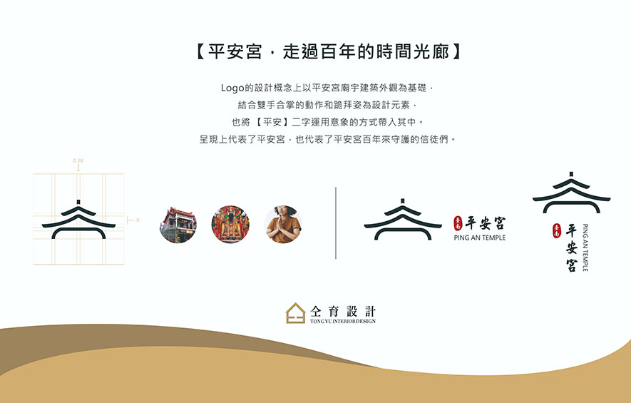 仝育設計有幸獲得百年老廟「台南平安宮」邀請,參與廟方新形象設計,新Logo以廟宇建築外觀為基礎,結合雙手合掌跪拜姿勢作為設計元素,並將「平安」二字意象融入其中,不僅代表平安宮,更象徵平安宮百年來守護的信眾。